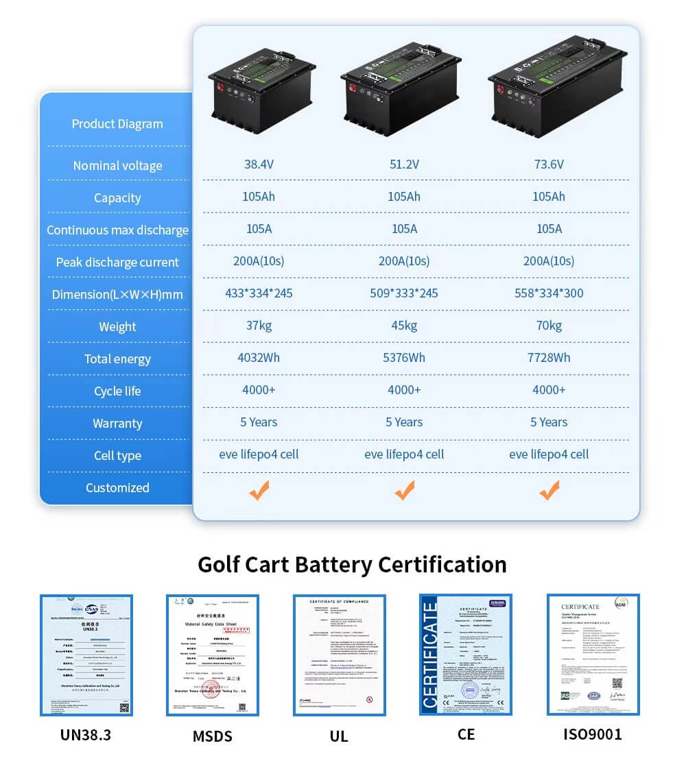 【Pametni LCD-zaslon za nadzor baterije】Litijeva baterija za golf voziček ALL IN ONE ponuja robustno pospeševanje in zmogljivost, kar uporabnikom omogoča premagovanje zahtevnega terena in podaljša doseg golfa do 80 kilometrov z enim polnjenjem.